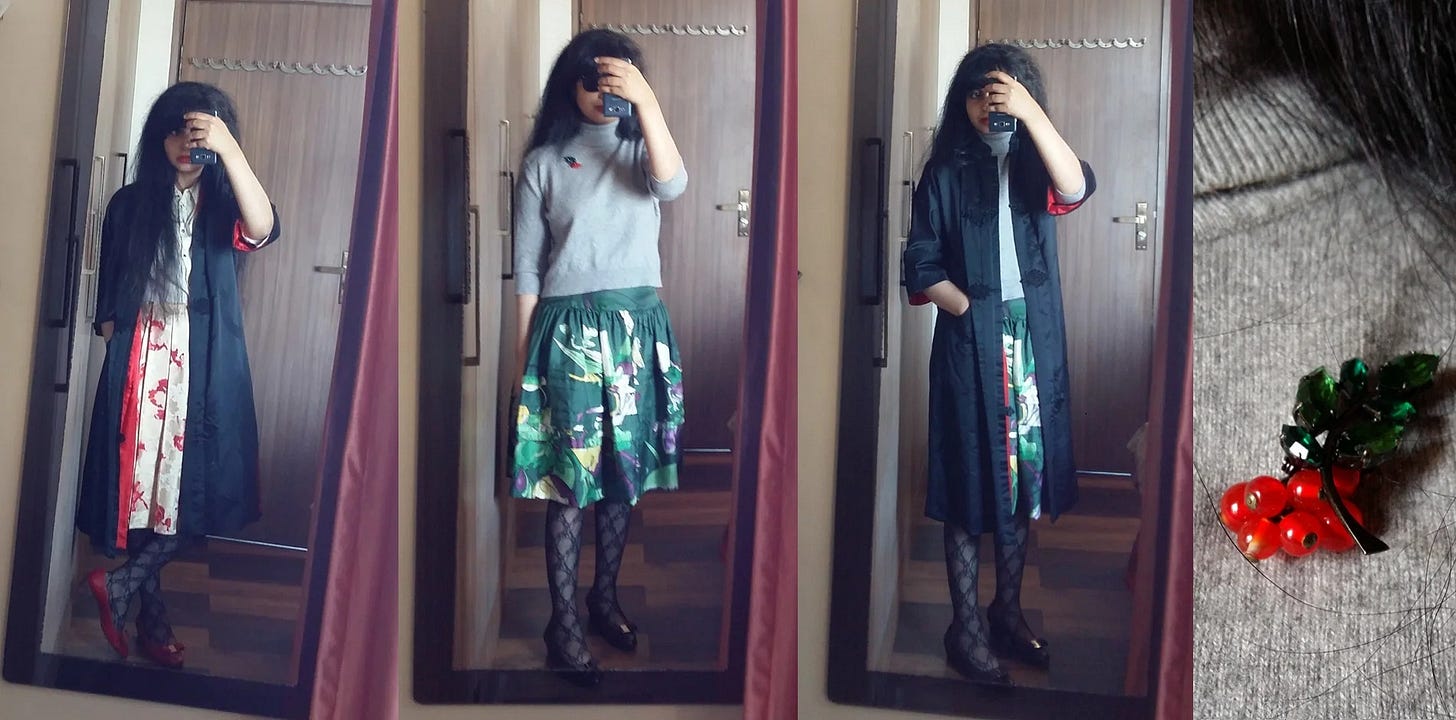December has always been my month to ‘dress’, by which I mean dress UP. That’s ‘up’ within certain limits; I won’t do very high heels or much makeup, tight trousers or skirts, or - condemn me for a snob here - polyester. Back in my salad days, the chief quality I sought in going-out looks was, in my head, a left-of-centre level of sexy that would draw compliments from girls and women I considered stylish while also being just wonky enough to not appeal to anyone I’d find undesirable (this made perfect sense at the time). This meant that I frequently relied for warmth on alcohol and tights (this also made perfect sense at the time).